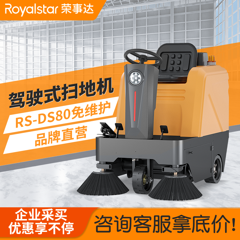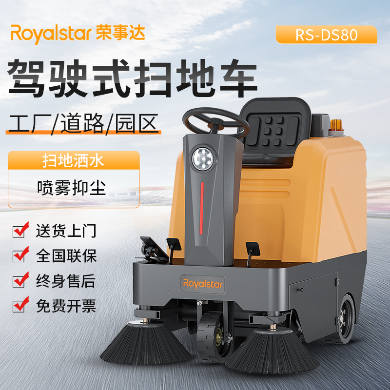 榮事達DS80 駕駛式掃地機設備配備了橡膠防滑大輪;安全防水防觸充電口;前大燈防撞、防水光線強,解決了使用過程中的一...