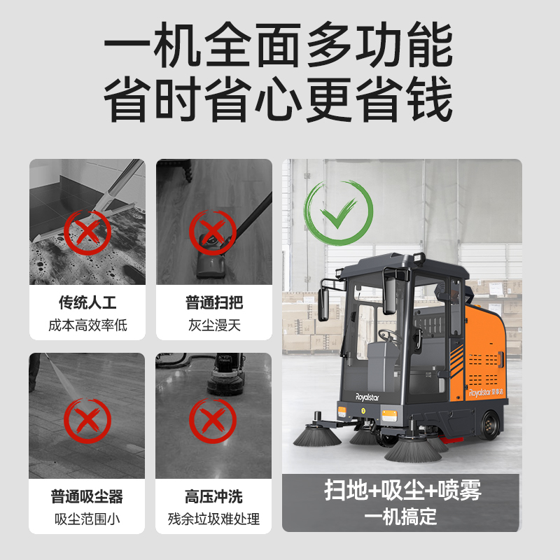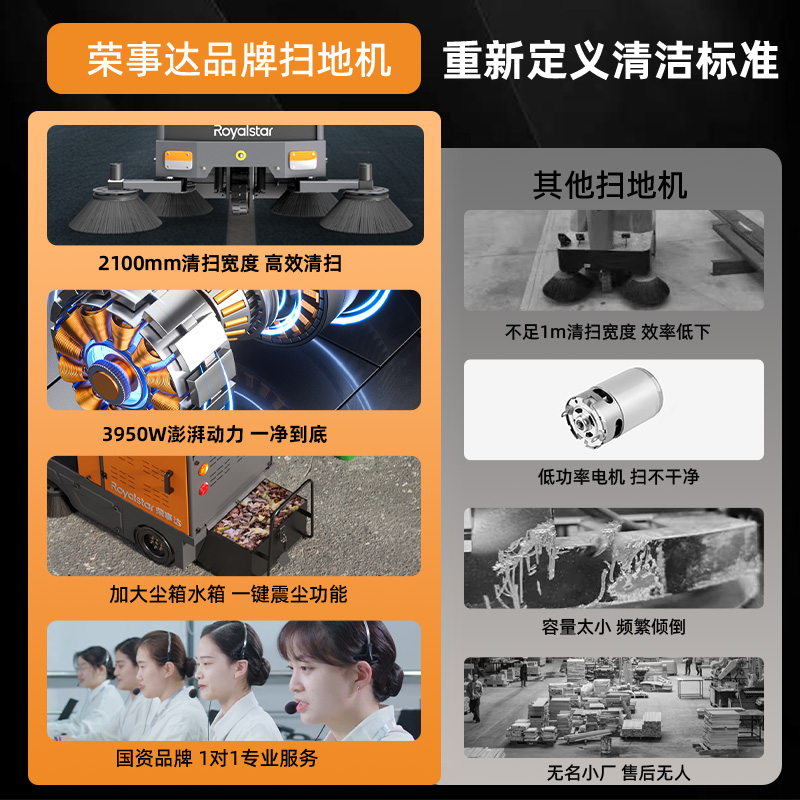 一臺榮事達掃地機可節省約16-18人勞動成本,4-5h超長續航,21000㎡/h清掃效率,2100mm清掃寬度,強勁...