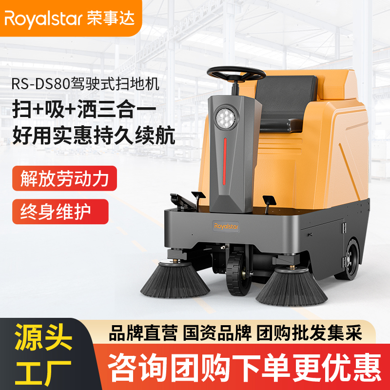 榮事達DS80 駕駛式掃地機設備配備了橡膠防滑大輪;安全防水防觸充電口;前大燈防撞、防水光線強,解決了使用過程中的一...